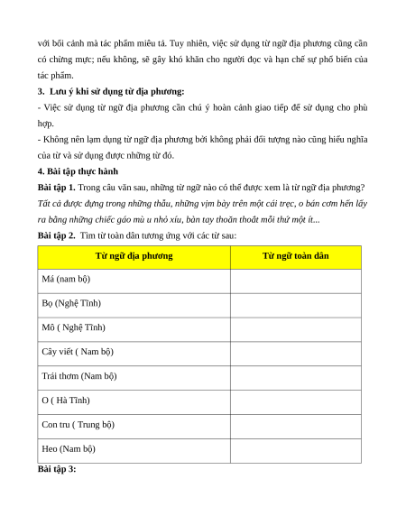 Bài tập 2. Tìm từ toàn dân tương ứng với các từ sau: