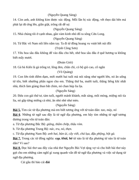 Tìm và giải thích nghĩa của các từ địa phương trong những câu dưới đây (ở đoạn trích