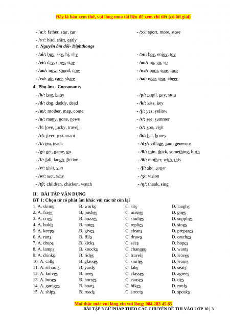 BT 1: Chọn từ có phát âm khác với các từ còn lại 1. A. skims B. works C. sits D. laughs 2. A. fixes B. pushes C. misses D. goes 3. A. cries B. buzzes C. studies D. supplies 4. A. holds B. notes C. replies D. sings 5. A. keeps B. gives C. cleans D. prepares 6. A. runs B. fills C. draws D. catches 7. A. drops B. kicks C. sees D. hopes 8. A. lamps B. knocks C. changes D. wants 9. A. drinks B. rides C. travels D. leaves 10. A. calls B. glasses C. smiles D. learns 11. A. schools B. yards C. labs D. seats 12. A. knives B. trees C. classes D. agrees 13. A. buses B. horses C. causes D. ties 14. A. garages B. boats C. bikes D. roofs 15. A. ships B. roads C. streets D. speaks