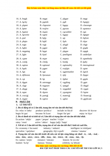 BT 3: Chọn từ có phát âm khác với các từ còn lại 1. A. head B. please C. heavy D. measure 2. A. note B. gloves C. some D. other 3. A. now B. how C. blow D. amount 4. A. dear B. year C. wear D. disappear 5. A. hate B. pan C. carrot D. matter 6. A. improved B. returned C. arrived D. stopped 7. A. nervous B. scout C. household D. mouse 8. A. favorite B. find C. outside D. library 9. A. last B. taste C. fast D. task 10. A. future B. summer C. number D. drummer 11. A. time B. kind C. bid D. nice 12. A. hard B. carry C. card D. yard 13. A. my B. baby C. spy D. cry 14. A. well B. get C. send D. pretty 15. A. weather B. ready C. mean D. head