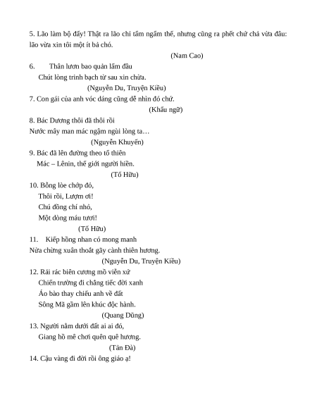 Mác – Lênin, thế giới người hiền. (Tố Hữu) 10. Bỗng lòe chớp đỏ, Thôi rồi, Lượm ơi! Chú đồng chí nhỏ, Một dòng máu tươi! (Tố Hữu)