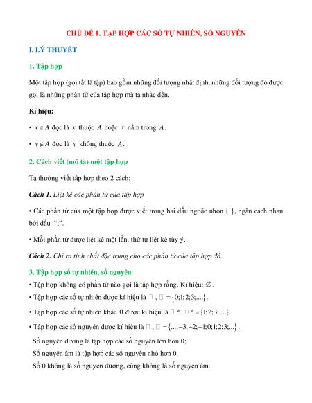 CHỦ ĐỀ 1. TẬP HỢP CÁC SỐ TỰ NHIÊN, SỐ NGUYÊN I. LÝ THUYẾT 1. Tập hợp
