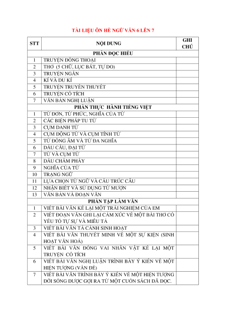 TÀI LIỆU ÔN HÈ NGỮ VĂN 6 LÊN 7 GHI STT NỘI DUNG CHÚ PHẦN ĐỌC HIỂU 1 TRUYỆN ĐỒNG THOẠI 2