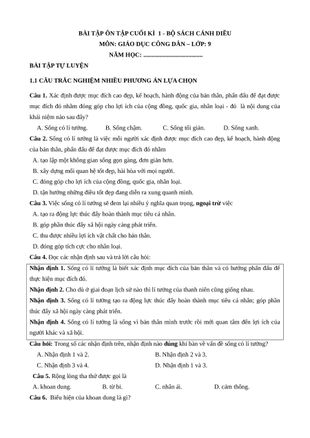 Bài tập ôn tập Cuối kì 1 GDCD 9 Cánh diều cấu trúc mới