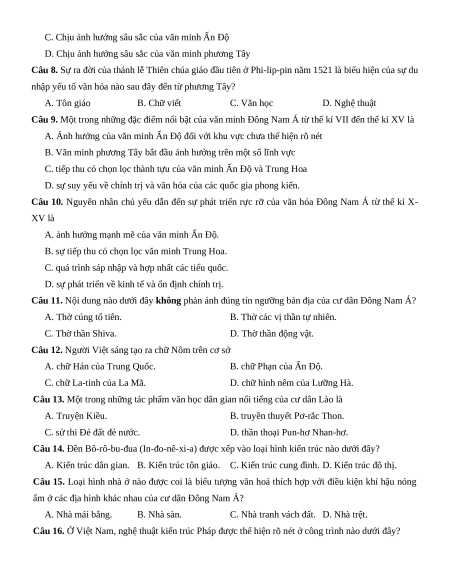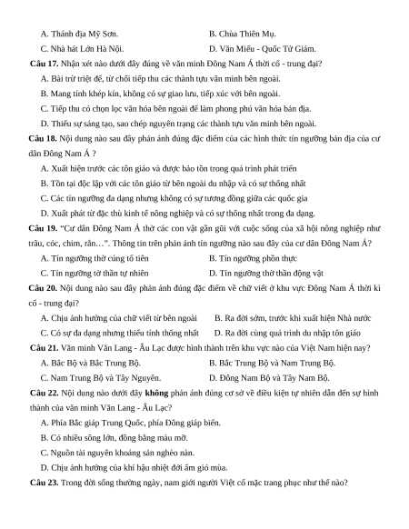 Câu 17. Nhận xét nào dưới đây đúng về văn minh Đông Nam Á thời cổ - trung đại?