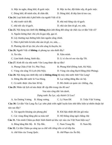 Câu 24. Loại hình nhà ở phổ biến của người Việt cổ là A. nhà tranh vách đất.