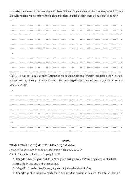 Câu 1. Em hãy kể 2 quyền và 2 nghĩa vụ cơ bản của công dân Việt Nam mà em đã được học. ….