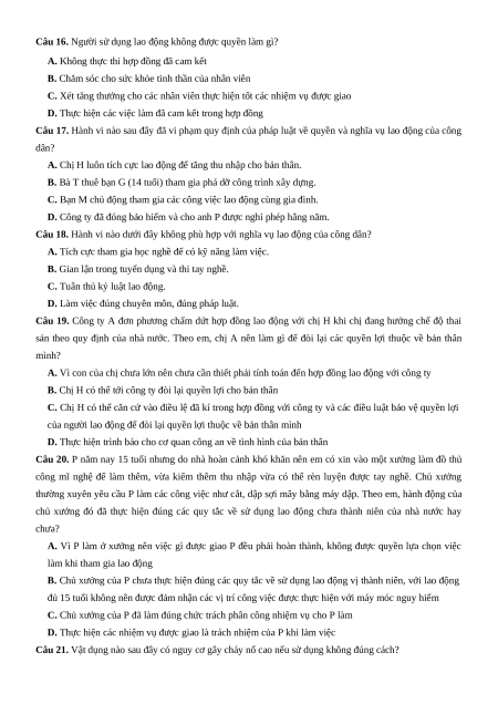 Câu 17. Hành vi nào sau đây đã vi phạm quy định của pháp luật về quyền và nghĩa vụ lao động của công dân?