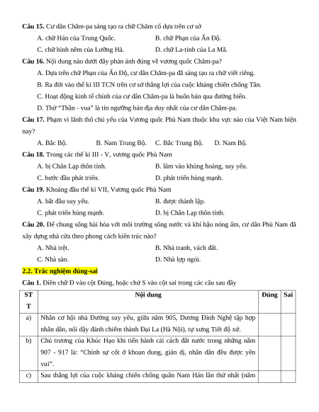 Câu 16. Nội dung nào dưới đây phản ánh đúng về vương quốc Chăm-pa?