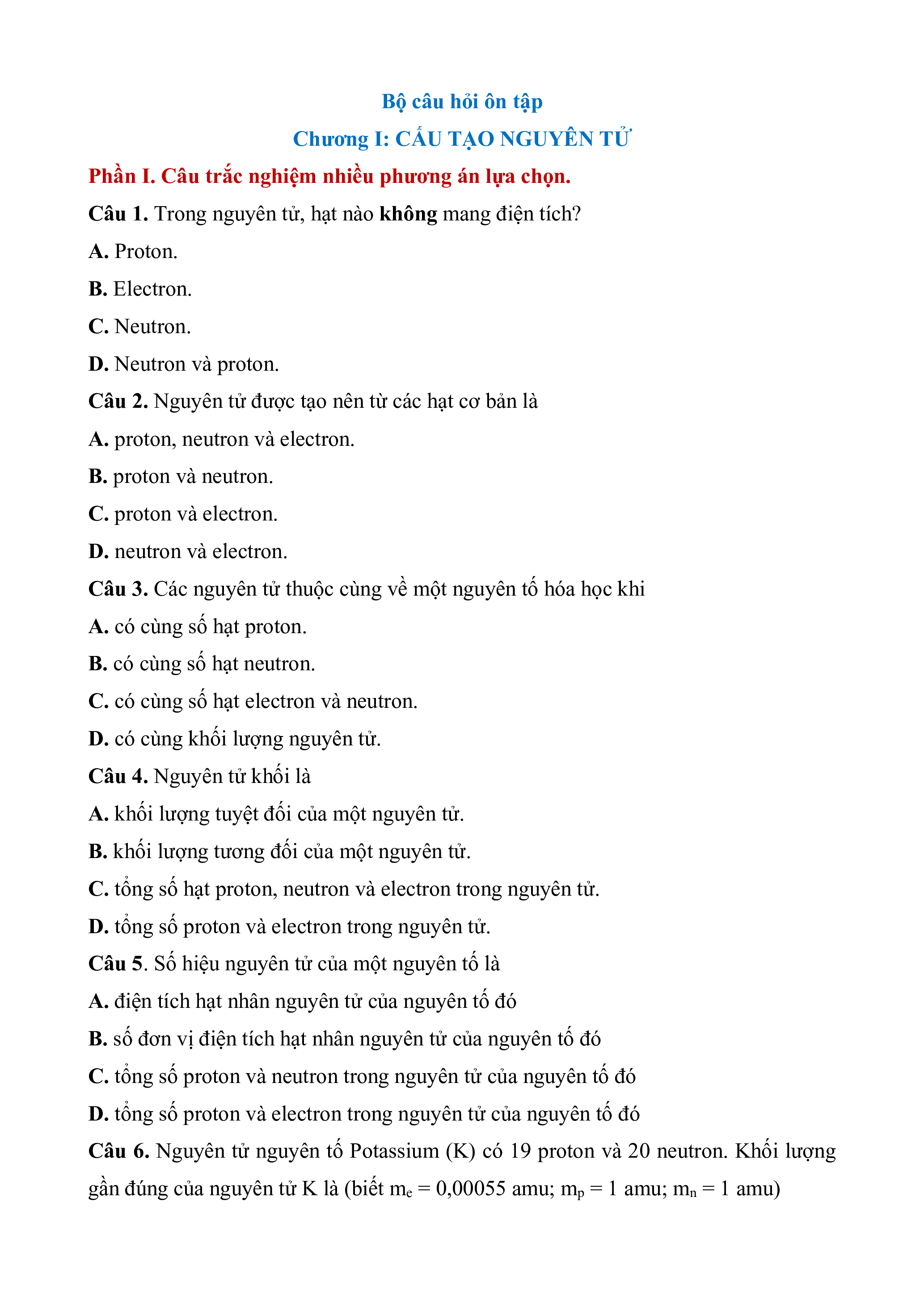 Câu 1. Trong nguyên tử, hạt nào không mang điện tích? A. Proton. B. Electron. C. Neutron. D. Neutron và proton.