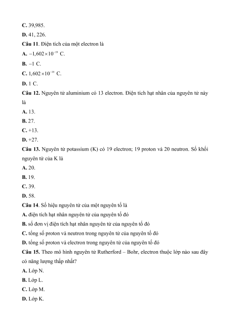 Câu 13. Nguyên tử potassium (K) có 19 electron; 19 proton và 20 neutron. Số khối nguyên tử của K là A. 20. B. 19. C. 39. D. 58.