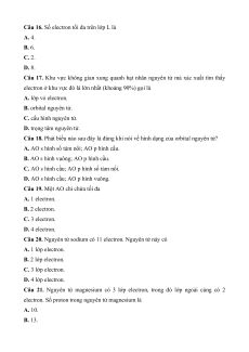 Câu 19. Một AO chỉ chứa tối đa A. 1 electron. B. 2 electron. C. 3 electron. D. 4 electron.