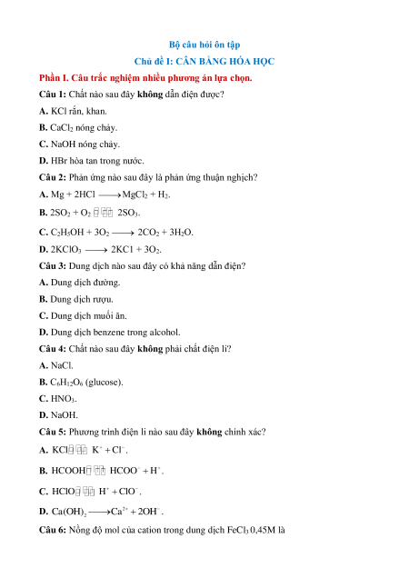 Câu 1: Chất nào sau đây không dẫn điện được? A. KCl rắn, khan. B. CaCl2 nóng chảy. C. NaOH nóng chảy.