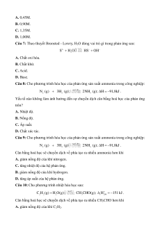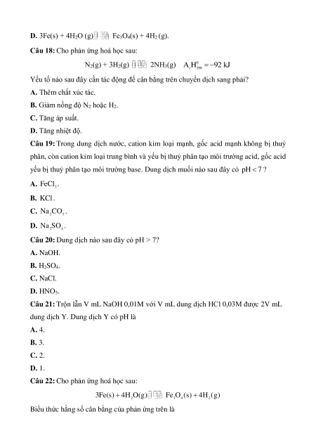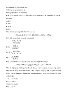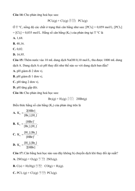 Câu 17: Cân bằng hoá học nào sau đây không bị chuyển dịch khỉ thay đổi áp suất? A. 2SO2(g) + O2(g) 2SO3(g). B. C(s) + H2O(g) CO(g) + H2(g). C. PCl3 (g) + Cl2(g) PCl5(g).