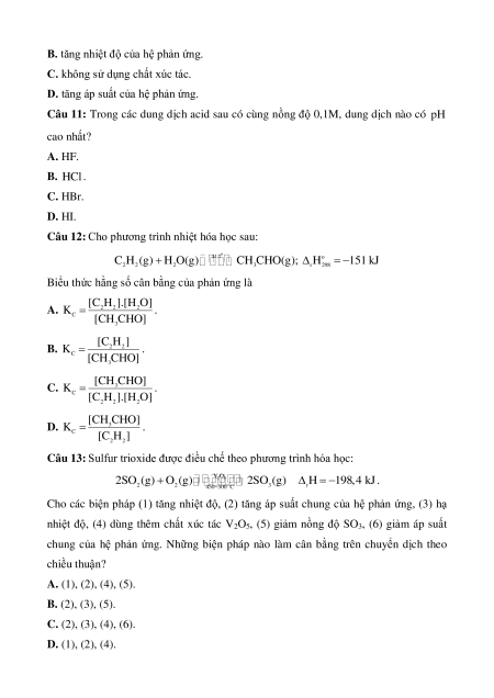 Câu 11: Trong các dung dịch acid sau có cùng nồng độ 0,1M, dung dịch nào có pH cao nhất? A. HF. B. HCl . C. HBr. D. HI.