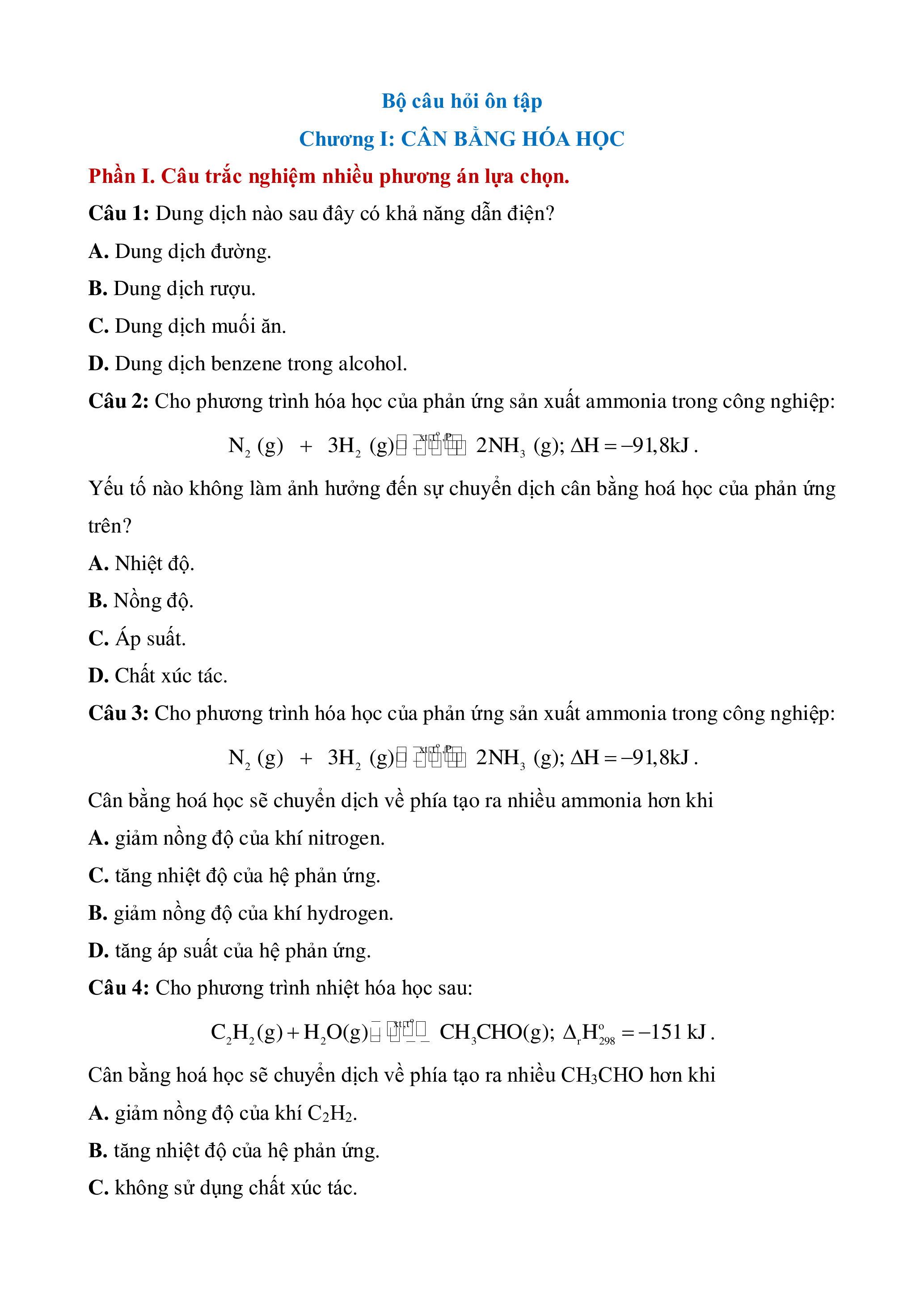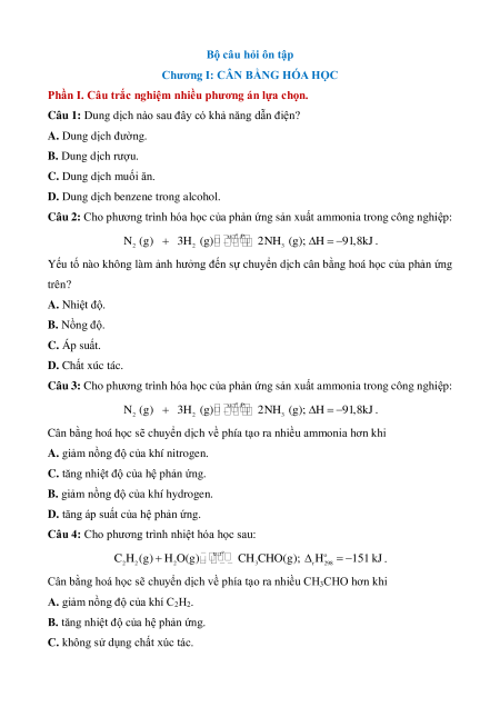 Yếu tố nào không làm ảnh hưởng đến sự chuyển dịch cân bằng hoá học của phản ứng trên? A. Nhiệt độ. B. Nồng độ. C. Áp suất. D. Chất xúc tác.
