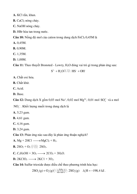 Câu 9: Chất nào sau đây không dẫn điện được? A. KCl rắn, khan. B. CaCl2 nóng chảy. C. NaOH nóng chảy.