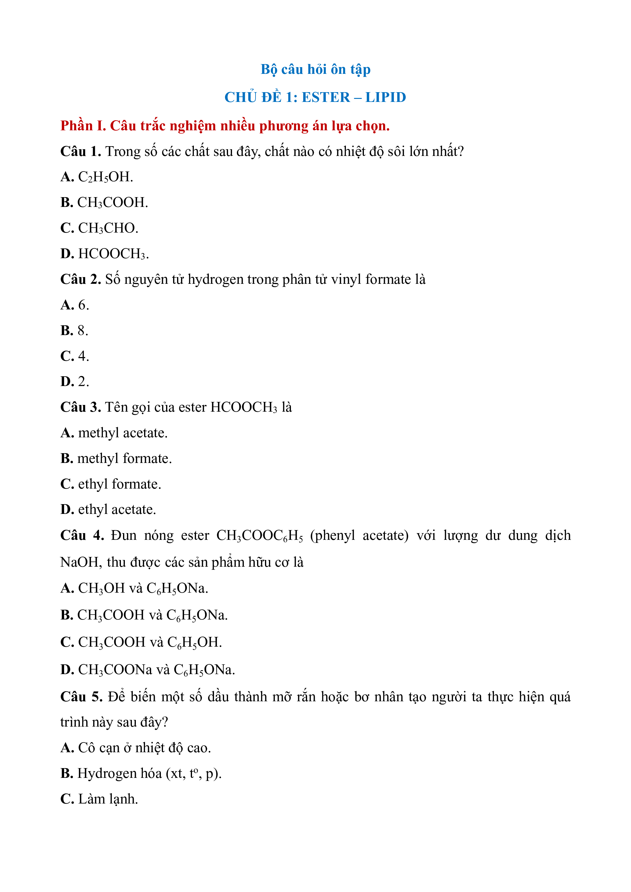 Câu 1. Trong số các chất sau đây, chất nào có nhiệt độ sôi lớn nhất? A. C2H5OH. B. CH3COOH. C. CH3CHO. D. HCOOCH3.