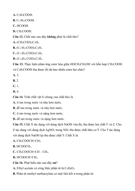Câu 12. Chất nào sau đây không phải là chất béo? A. (CH3COO)3C3H5. B. (C17H35COO)3C3H5. C. (C17H33COO)3C3H5. D. (C15H31COO)3C3H5.