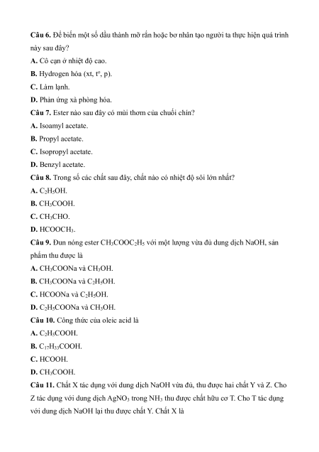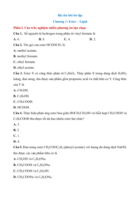Câu 1. Số nguyên tử hydrogen trong phân tử vinyl formate là A. 6. B. 8. C. 4. D. 2.