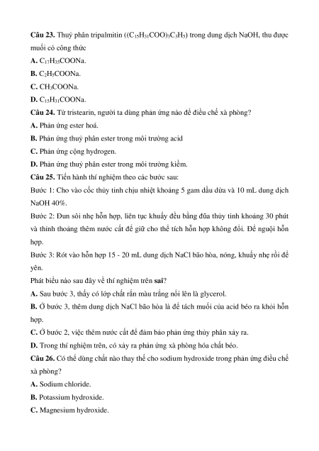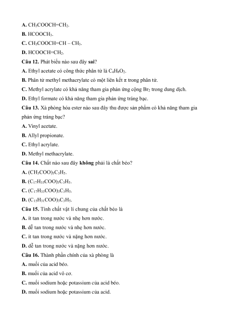 Câu 14. Chất nào sau đây không phải là chất béo? A. (CH3COO)3C3H5. B. (C17H35COO)3C3H5. C. (C17H33COO)3C3H5. D. (C15H31COO)3C3H5.