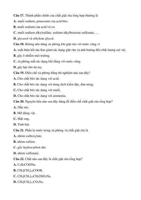 Câu 22. Chất nào sau đây là chất giặt rửa tổng hợp? A. C2H5COONa.