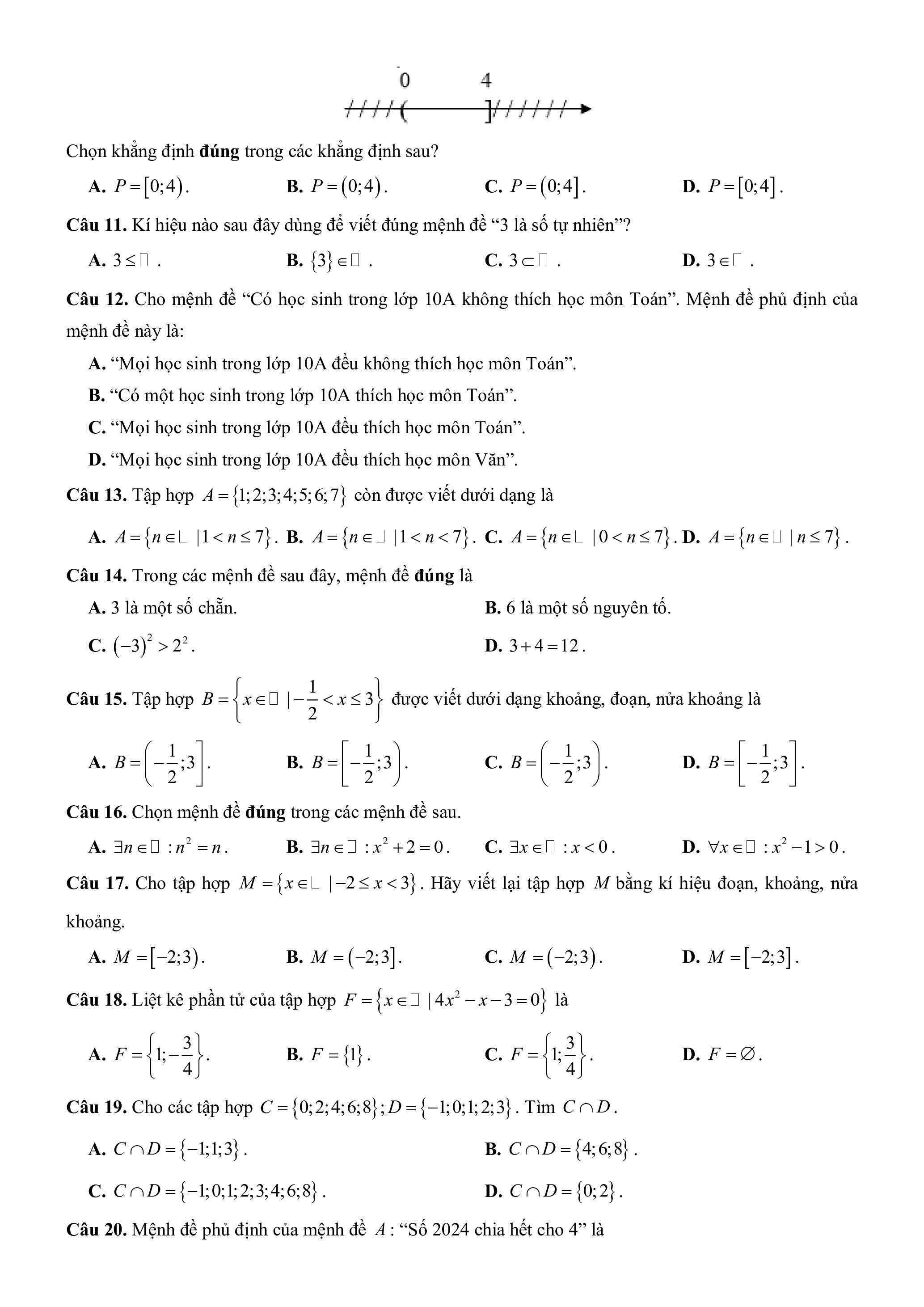 Câu 12. Cho mệnh đề “Có học sinh trong lớp 10A không thích học môn Toán”. Mệnh đề phủ định của mệnh đề này là:
