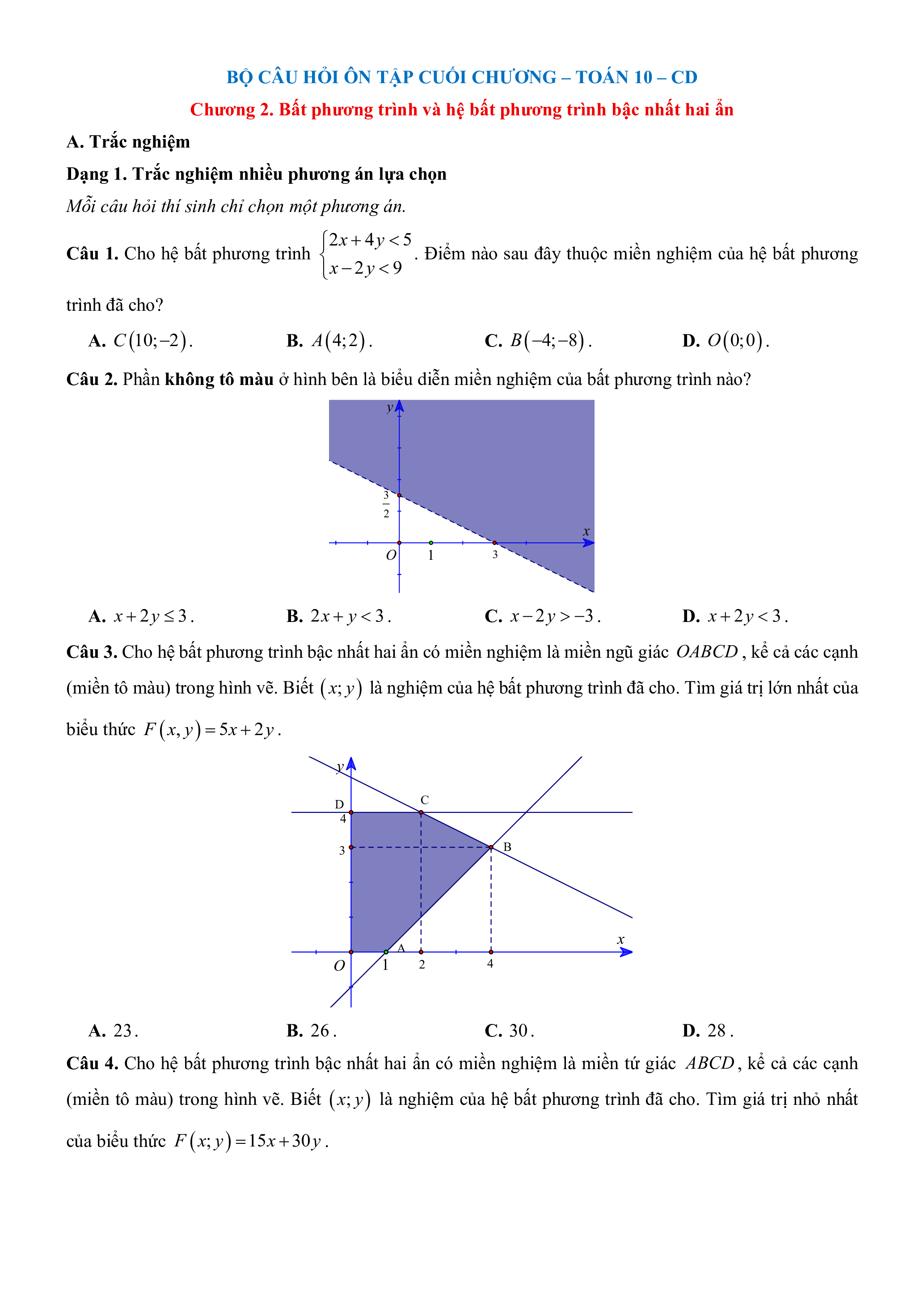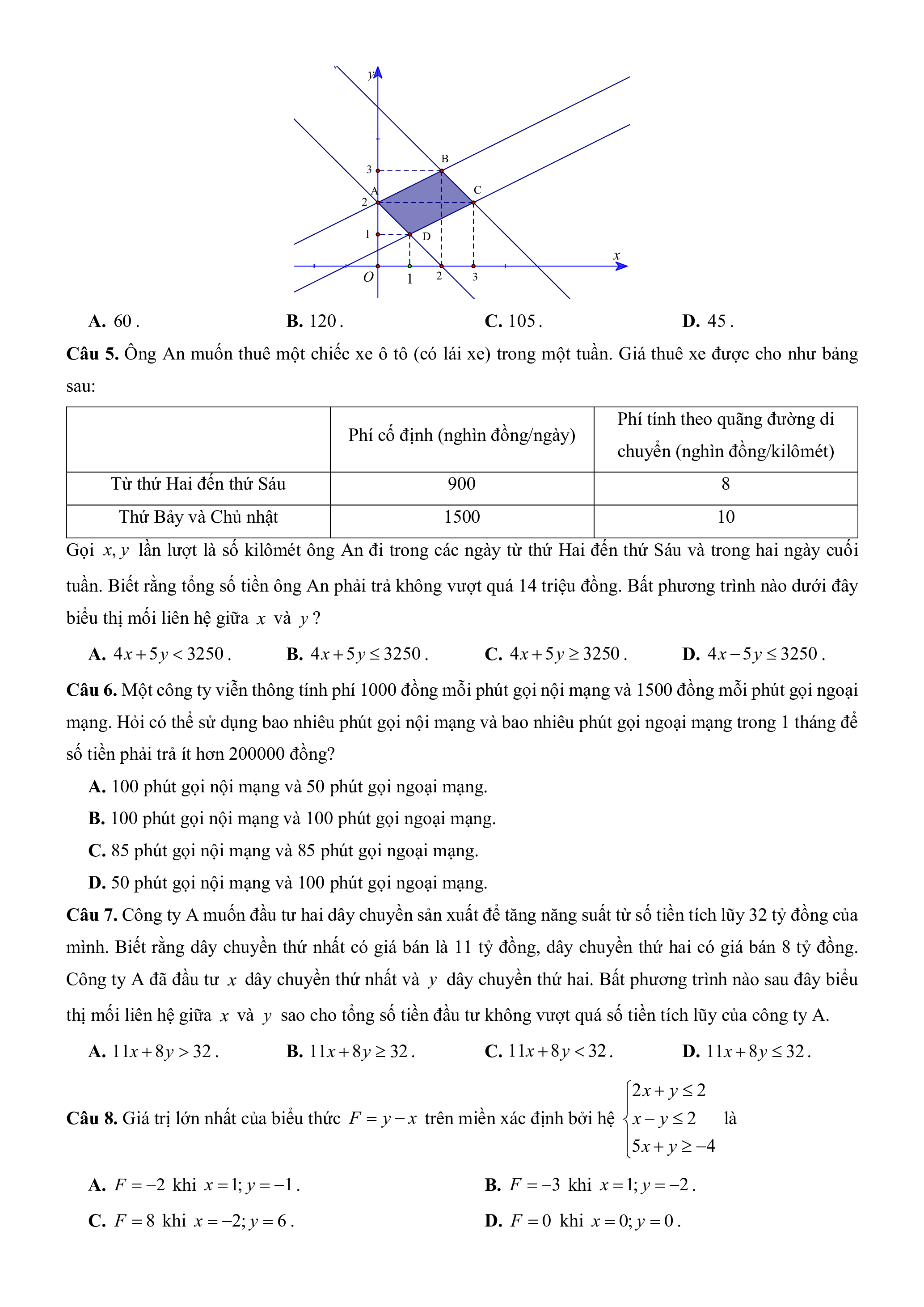 Câu 4. Cho hệ bất phương trình bậc nhất hai ẩn có miền nghiệm là miền tứ giác ABCD , kể cả các cạnh