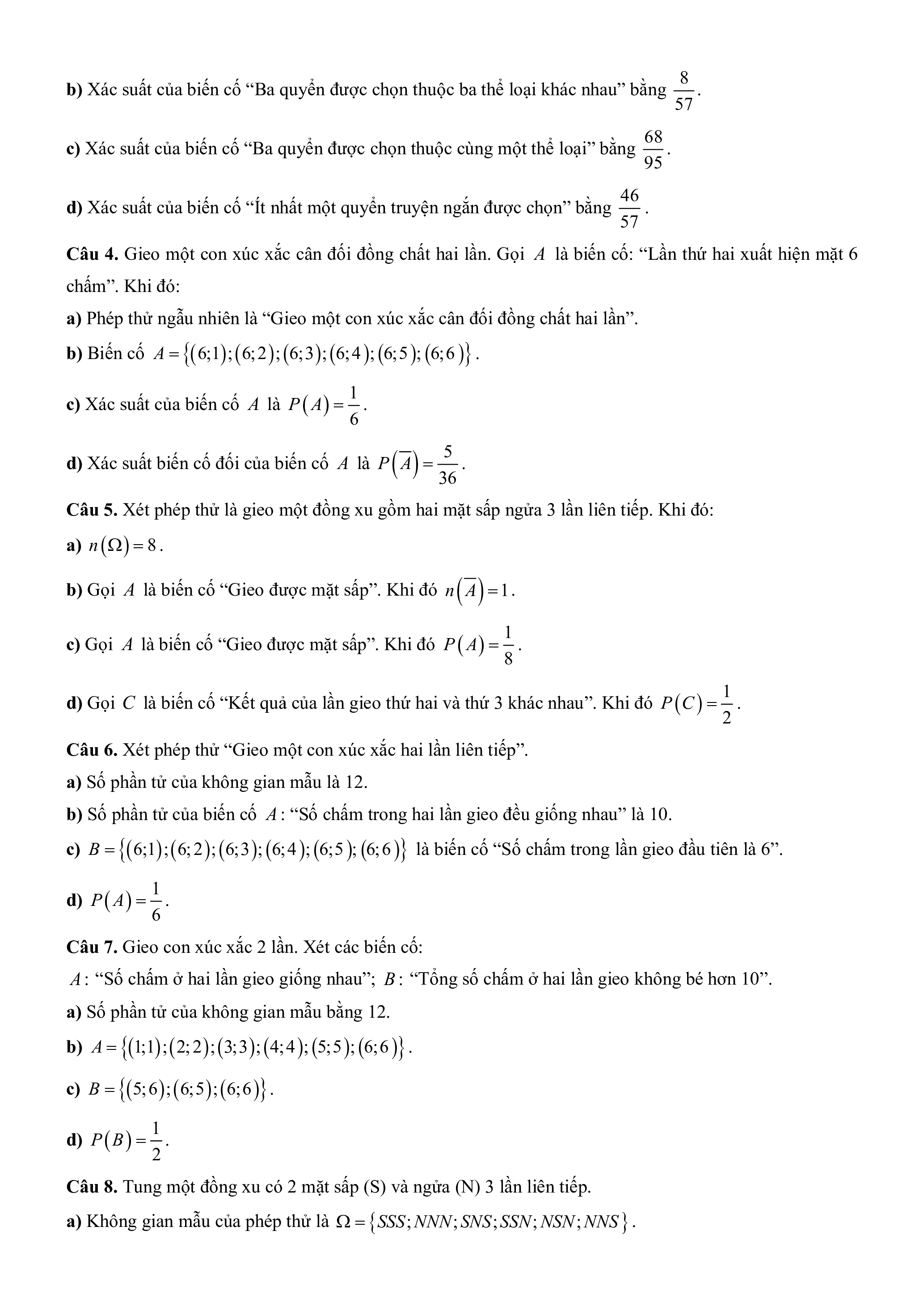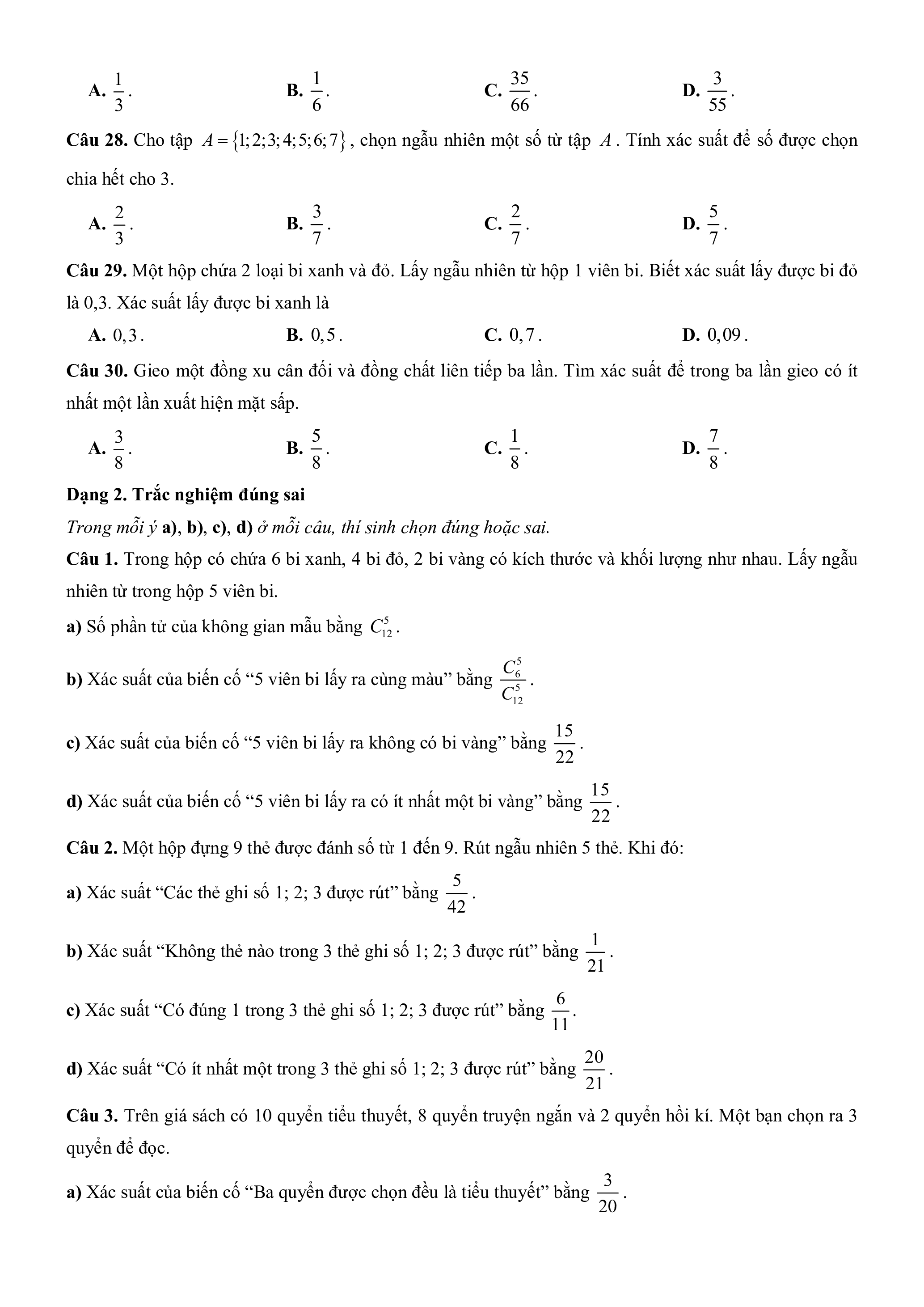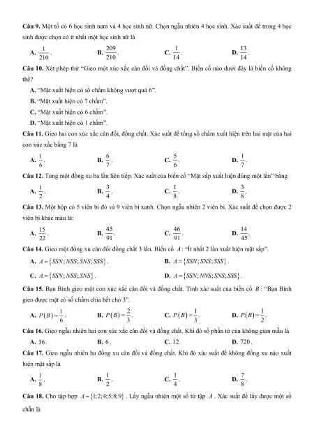 Câu 14. Gieo một đồng xu cân đối đồng chất 3 lần. Biến cố A : “Ít nhất 2 lần xuất hiện mặt sấp”.