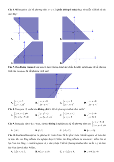 Câu 6. Miền nghiệm của bất phương trình x + y 2 (phần không tô màu) được biểu diễn bởi hình vẽ nào dưới đây? y y 2 2 x x O 1 O 1 2 2 A. . B. . y y 2 2 x -2 O 1 x -2 O 1 C. . D. .