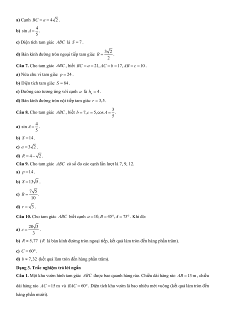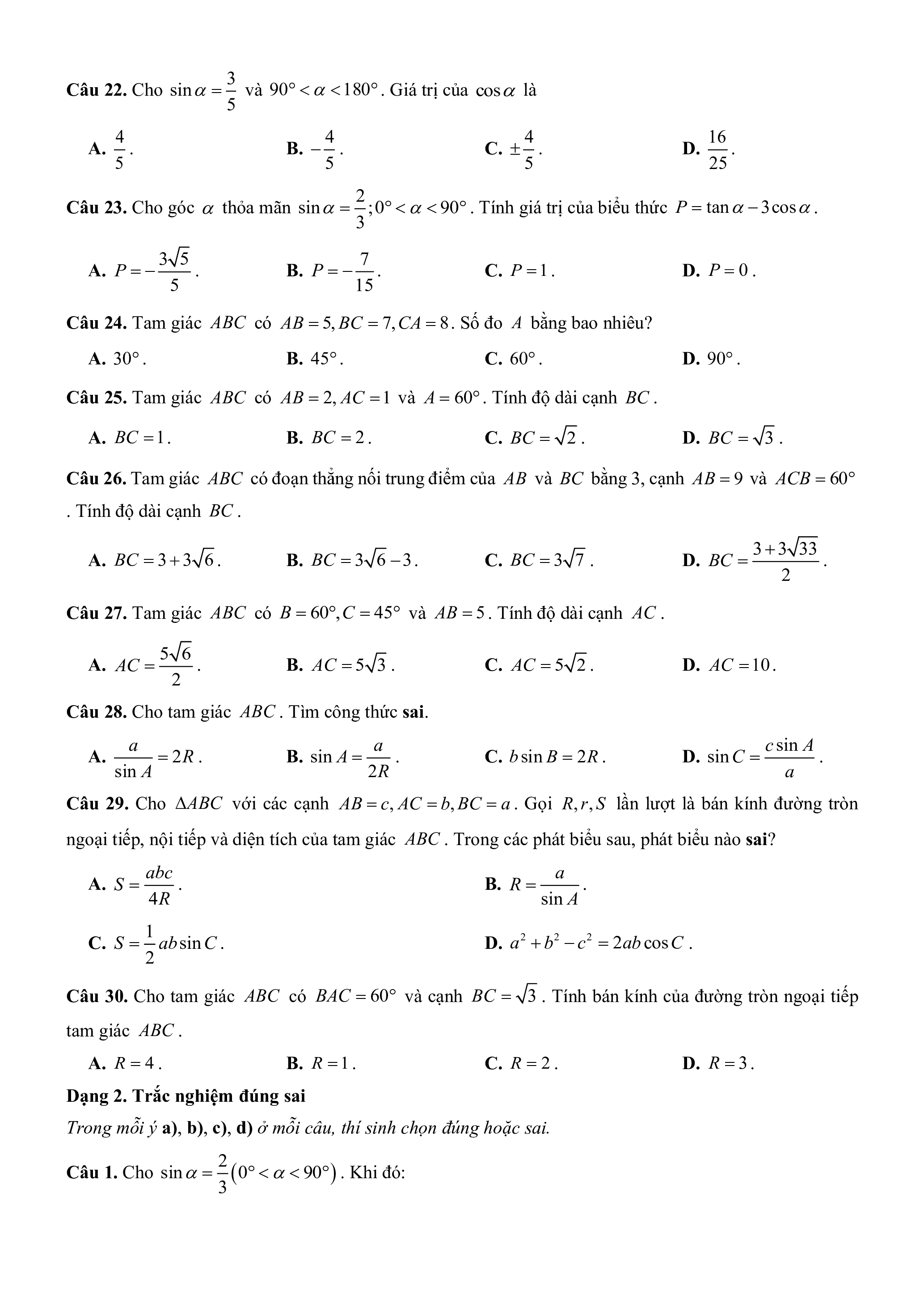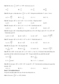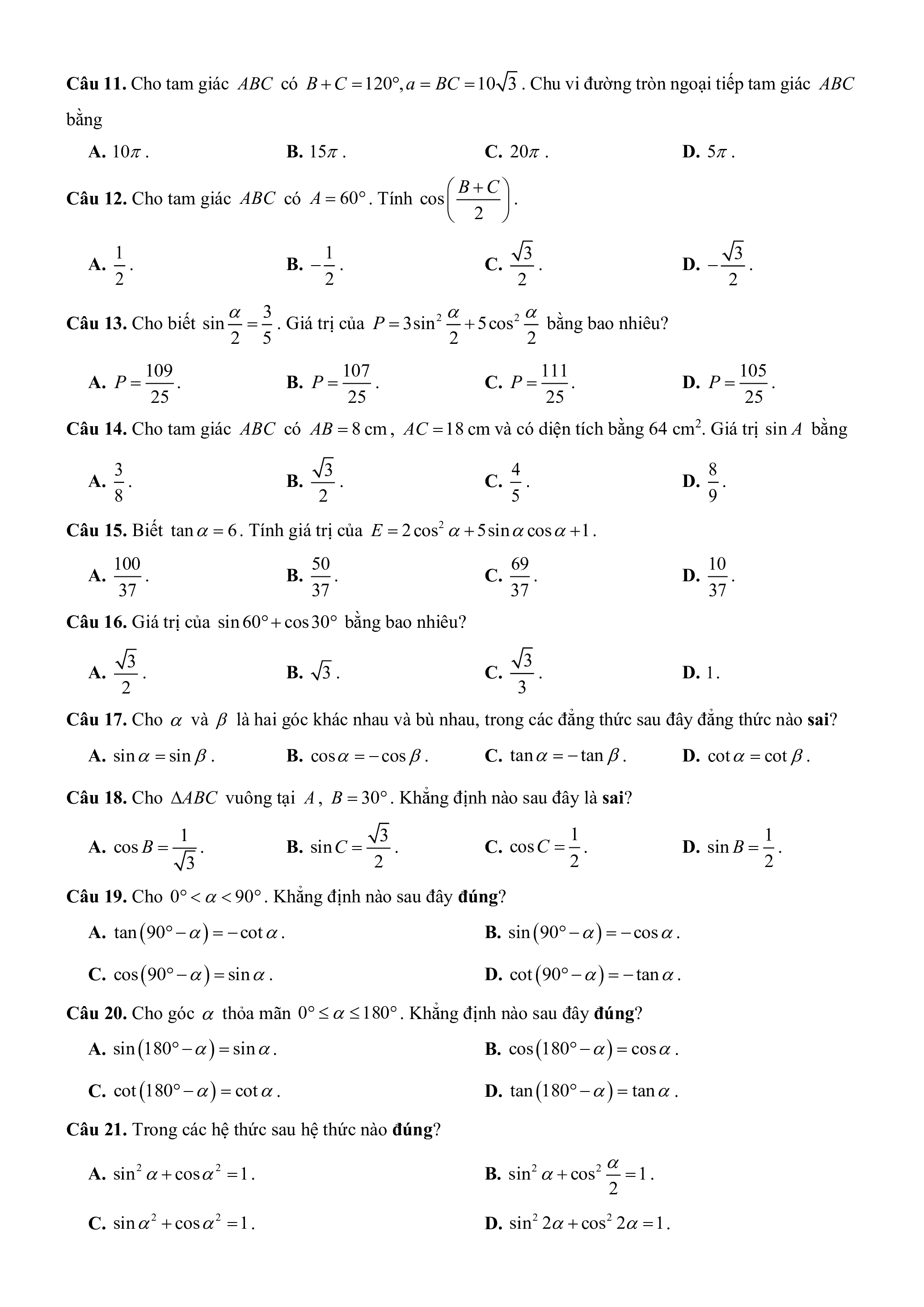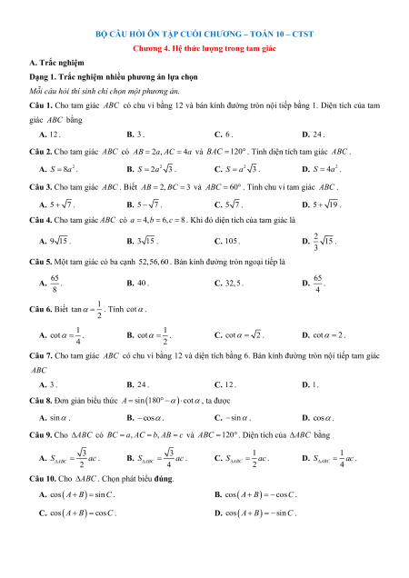 Chương 4. Hệ thức lượng trong tam giác A. Trắc nghiệm