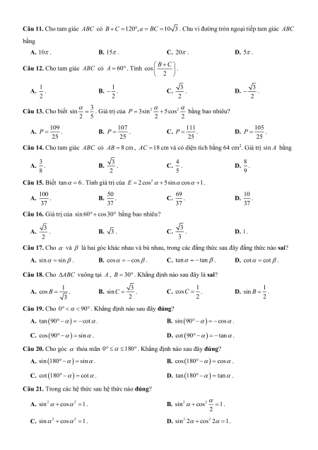 Câu 12. Cho tam giác ABC có A = 60 . Tính cos . 2 1 1 3 3 A. . B. − . C. . D. − . 2 2 2 2 3 Câu 13. Cho biết sin = . Giá trị của 2 2 P = 3sin + 5cos bằng bao nhiêu? 2 5 2 2 109 107 111 105 A. P = . B. P = . C. P = . D. P = . 25 25 25 25