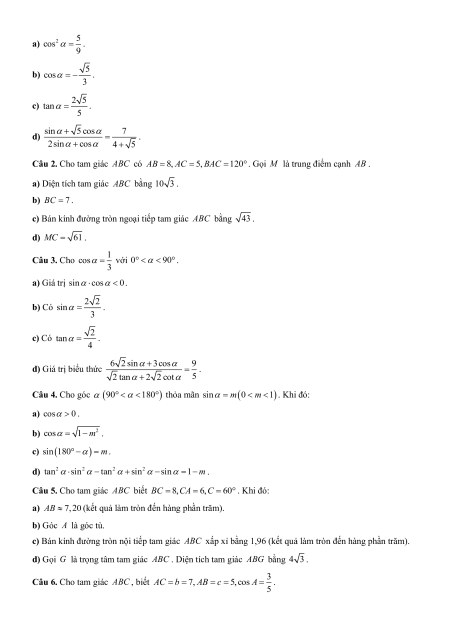 Câu 4. Cho góc (90 180) thỏa mãn sin = m(0 m ) 1 . Khi đó: a) cos 0 . b) 2 cos = 1− m .