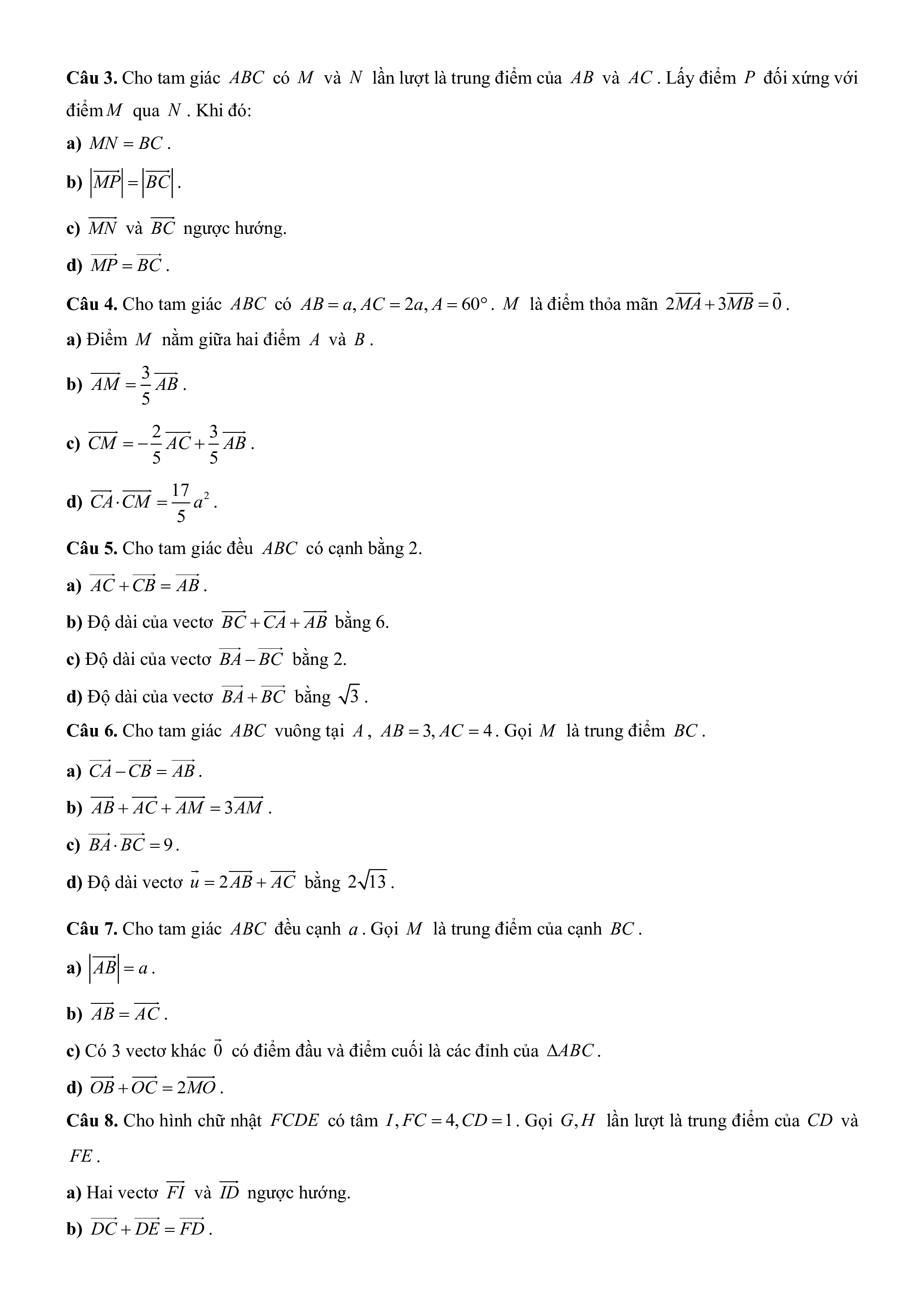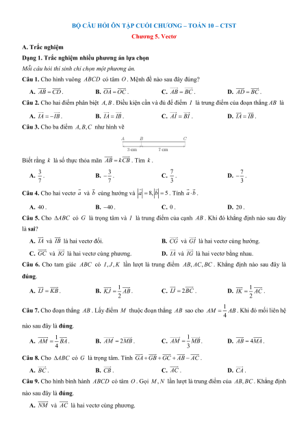 BỘ CÂU HỎI ÔN TẬP CUỐI CHƯƠNG – TOÁN 10 – CTST Chương 5. Vectơ A. Trắc nghiệm