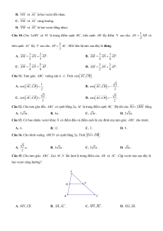 Câu 11. Tam giác ABC vuông cân ở A . Tính cos( AC,CB) . A. (AC CB) 1 cos , = . B. (AC CB) 2 cos , = − . 2 2 C. (AC CB) 2 cos , = . D. (AC CB) 3 cos , = − . 2 2