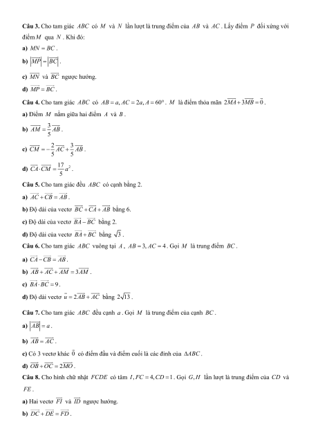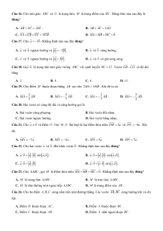 Câu 13. Có bao nhiêu vectơ khác 0 có điểm đầu và điểm cuối là các đỉnh của tam giác ABC cho trước. A. 6 . B. 12 . C. 3 . D. 9 .