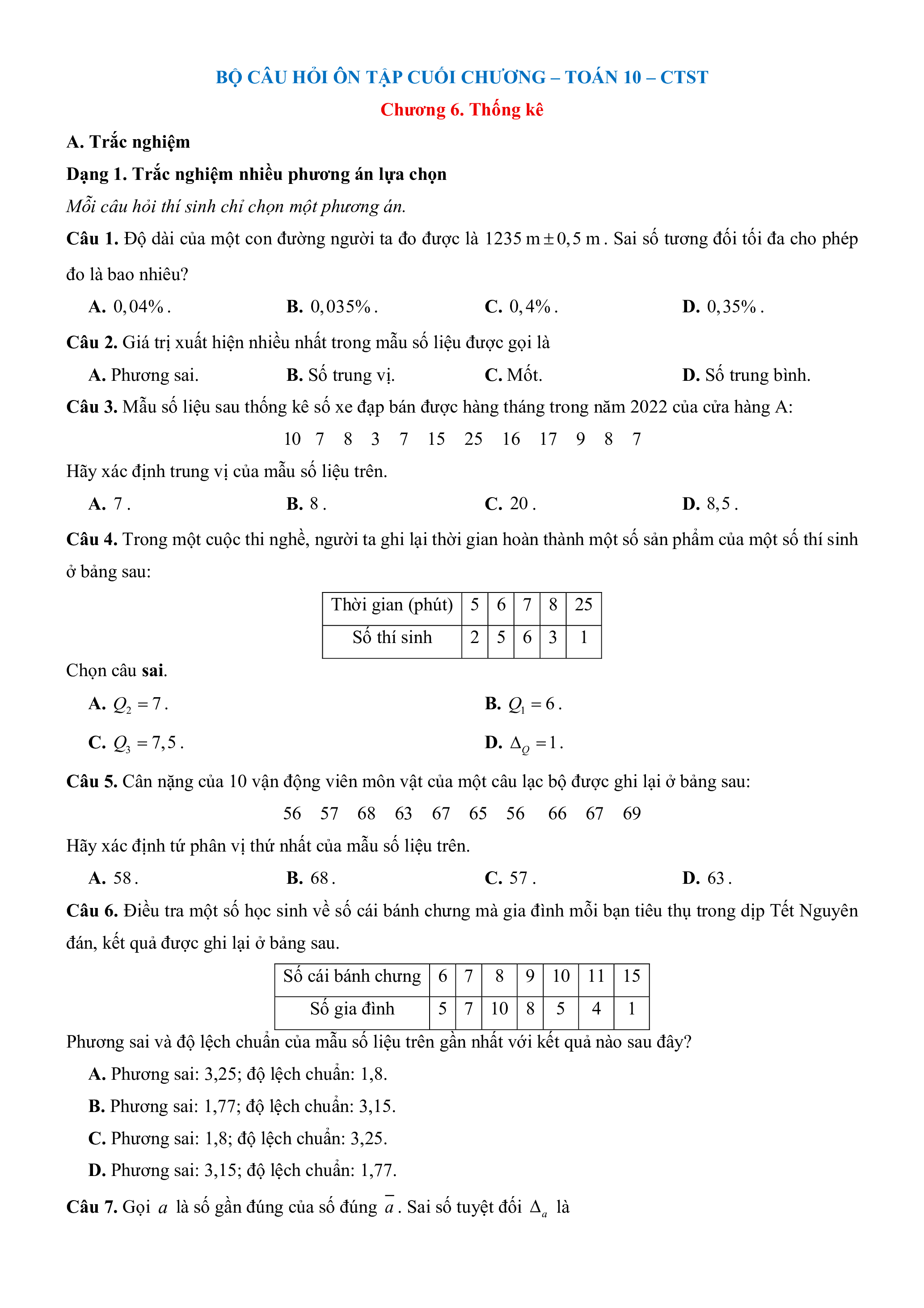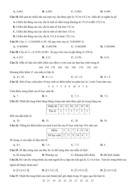 Câu 1. Độ dài của một con đường người ta đo được là 1235 m 0,5 m . Sai số tương đối tối đa cho phép đo là bao nhiêu? A. 0, 04% . B. 0, 035% . C. 0, 4% . D. 0,35% .