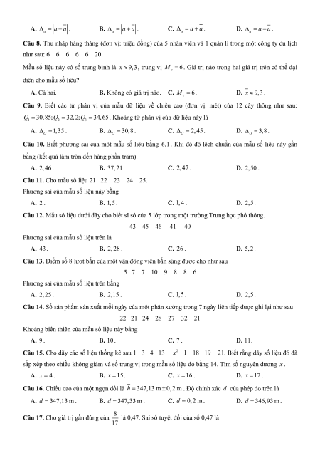 Câu 25. Số đặc trưng nào sau đây đo xu thế trung tâm của mẫu số liệu? A. Số trung bình. B. Phương sai.