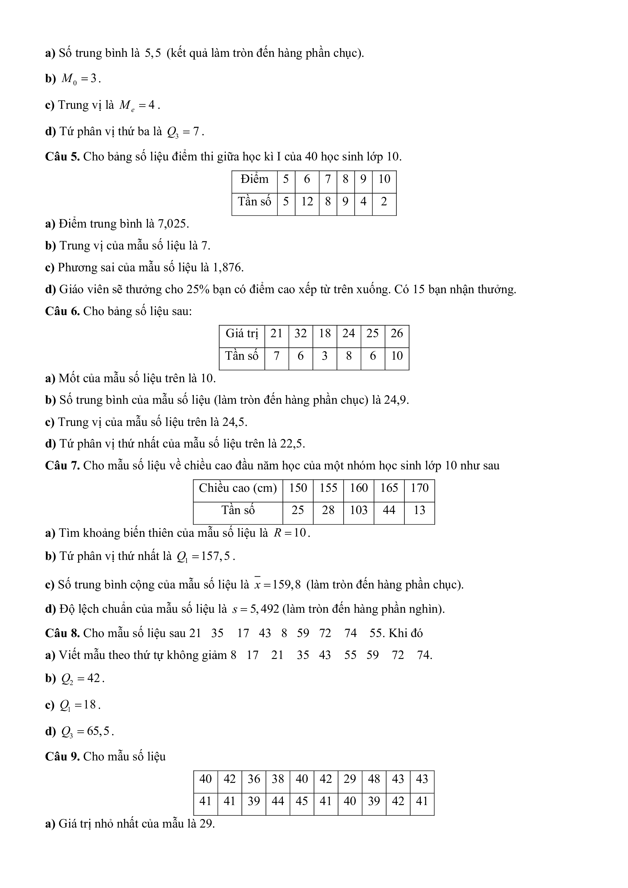 Câu 22. Một tổ học sinh gồm 10 học sinh có điểm kiểm tra giữa học kì 1 môn Toán như sau: 5 6 7 5 8 8 10 9 7 8.