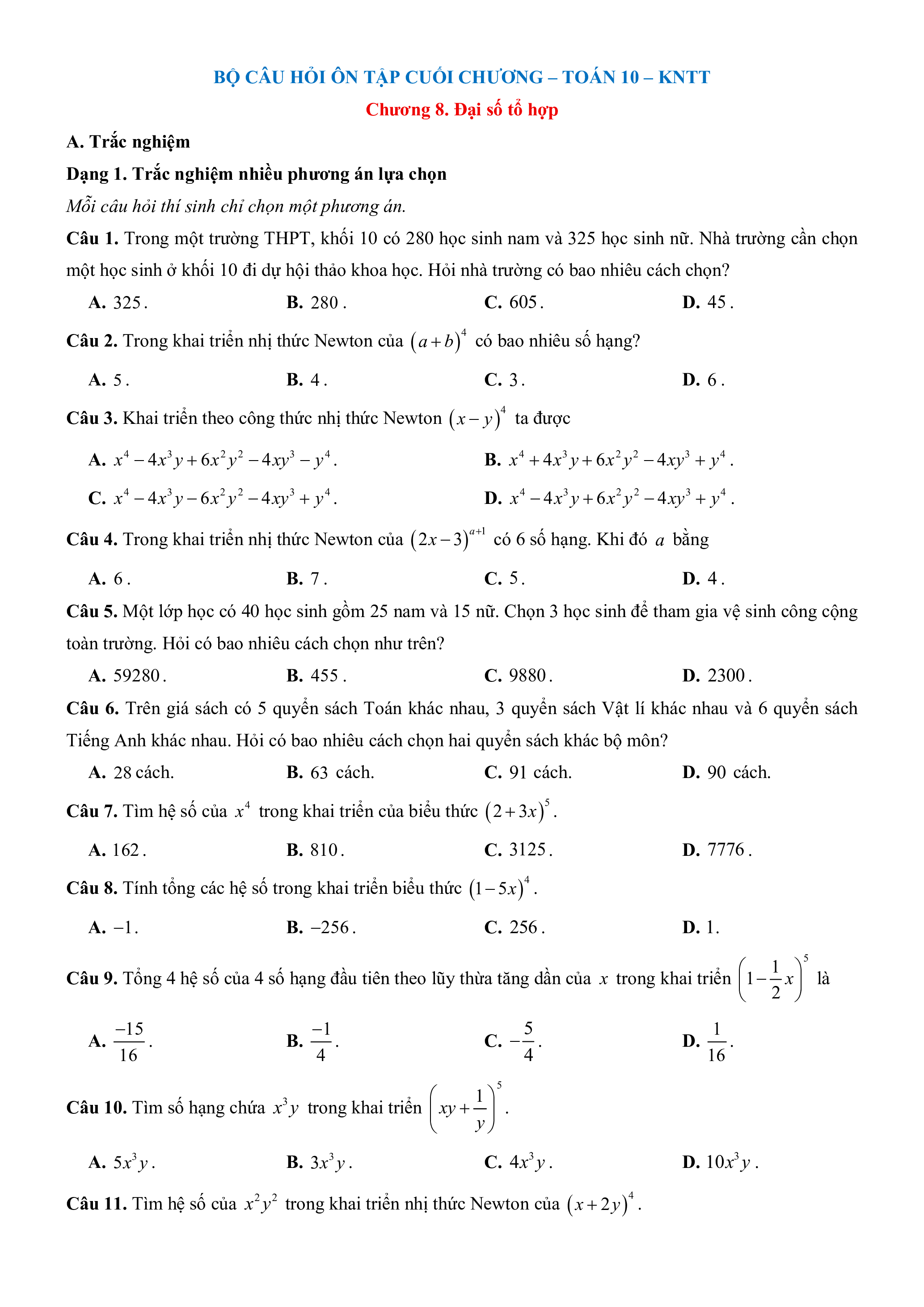 Câu 1. Trong một trường THPT, khối 10 có 280 học sinh nam và 325 học sinh nữ. Nhà trường cần chọn