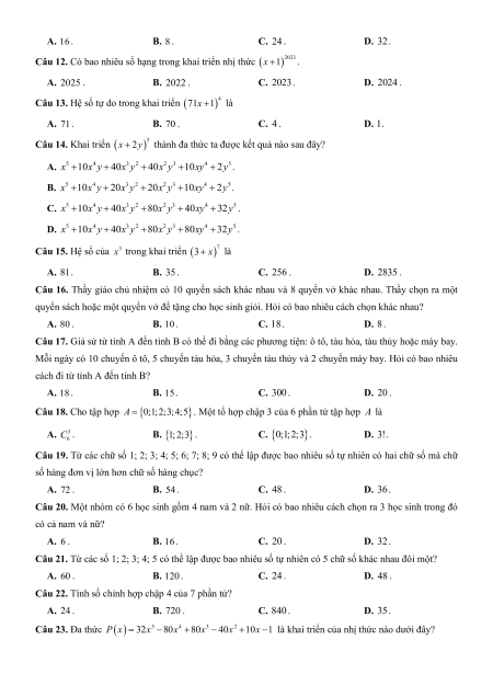 Câu 12. Có bao nhiêu số hạng trong khai triển nhị thức x 2023 1 . A. 2025 . B. 2022 . C. 2023. D. 2024 .