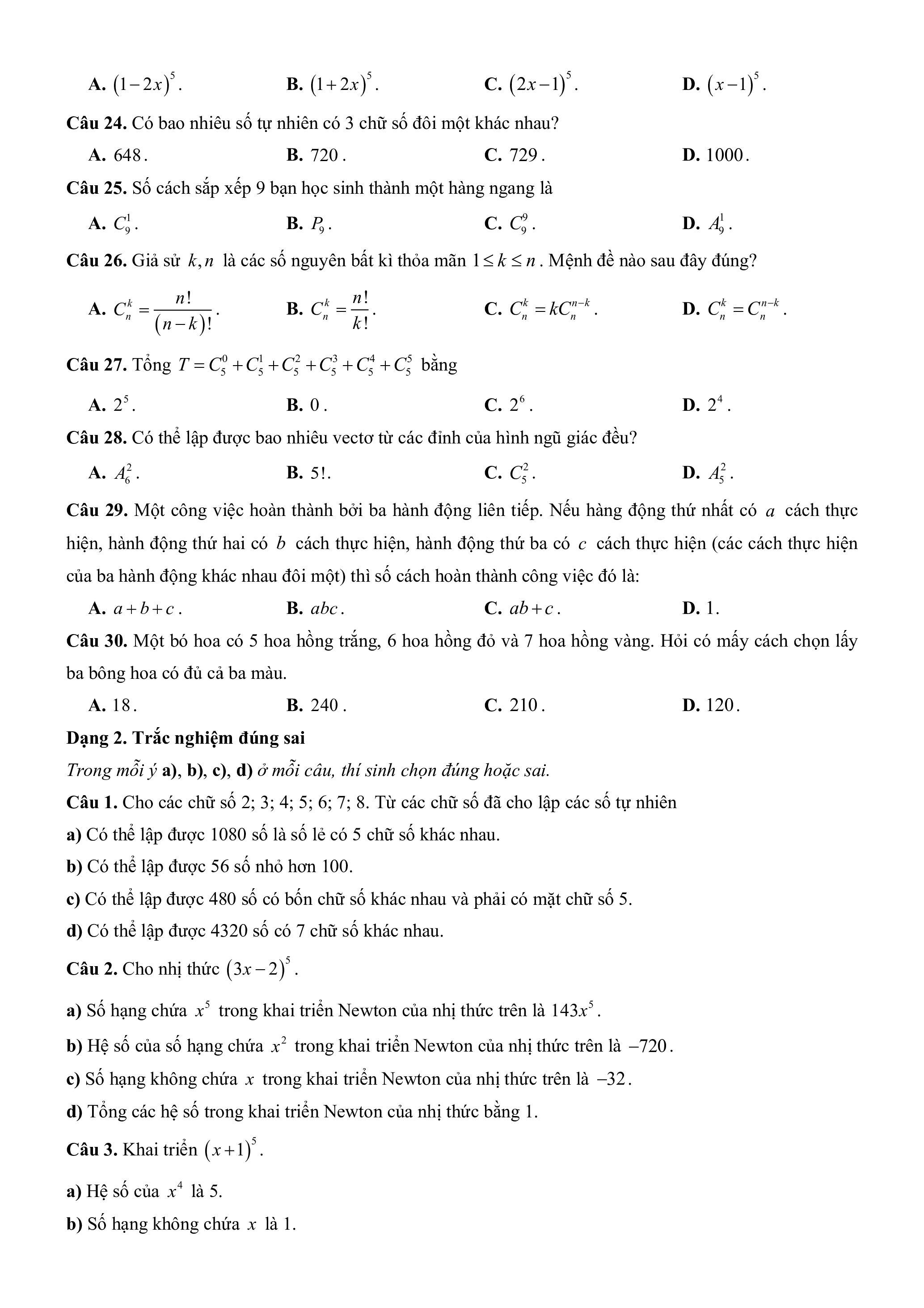Câu 30. Một bó hoa có 5 hoa hồng trắng, 6 hoa hồng đỏ và 7 hoa hồng vàng. Hỏi có mấy cách chọn lấy