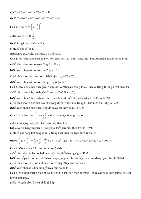 Câu 3. Khai triển x 5 1 . a) Hệ số của 4 x là 5.