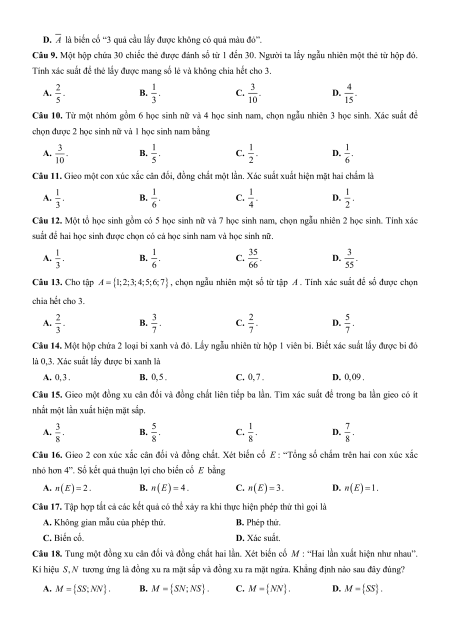 Câu 18. Tung một đồng xu cân đối và đồng chất hai lần. Xét biến cố M : “Hai lần xuất hiện như nhau”.
