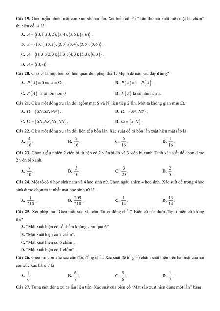 Câu 29. Gieo một đồng xu cân đối đồng chất 3 lần. Biến cố A : “Ít nhất 2 lần xuất hiện mặt sấp”.