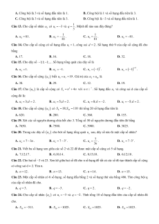 Câu 22. Cho hai số −3 và 23. Xen kẽ giữa hai số đã cho n số hạng để tất cả các số đó tạo thành cấp số cộng có công sai d = 2. Tìm n. A. n 12 . B. n 13. C. n 14 . D. n 15.