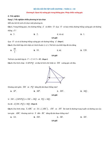 Câu 1. Trong không gian, cho đường thẳng d và điểm O . Qua O có bao nhiêu đường thẳng vuông góc với đường thẳng d ? A. 3 . B. 2 . C. Vô số. D. 1. Lời giải