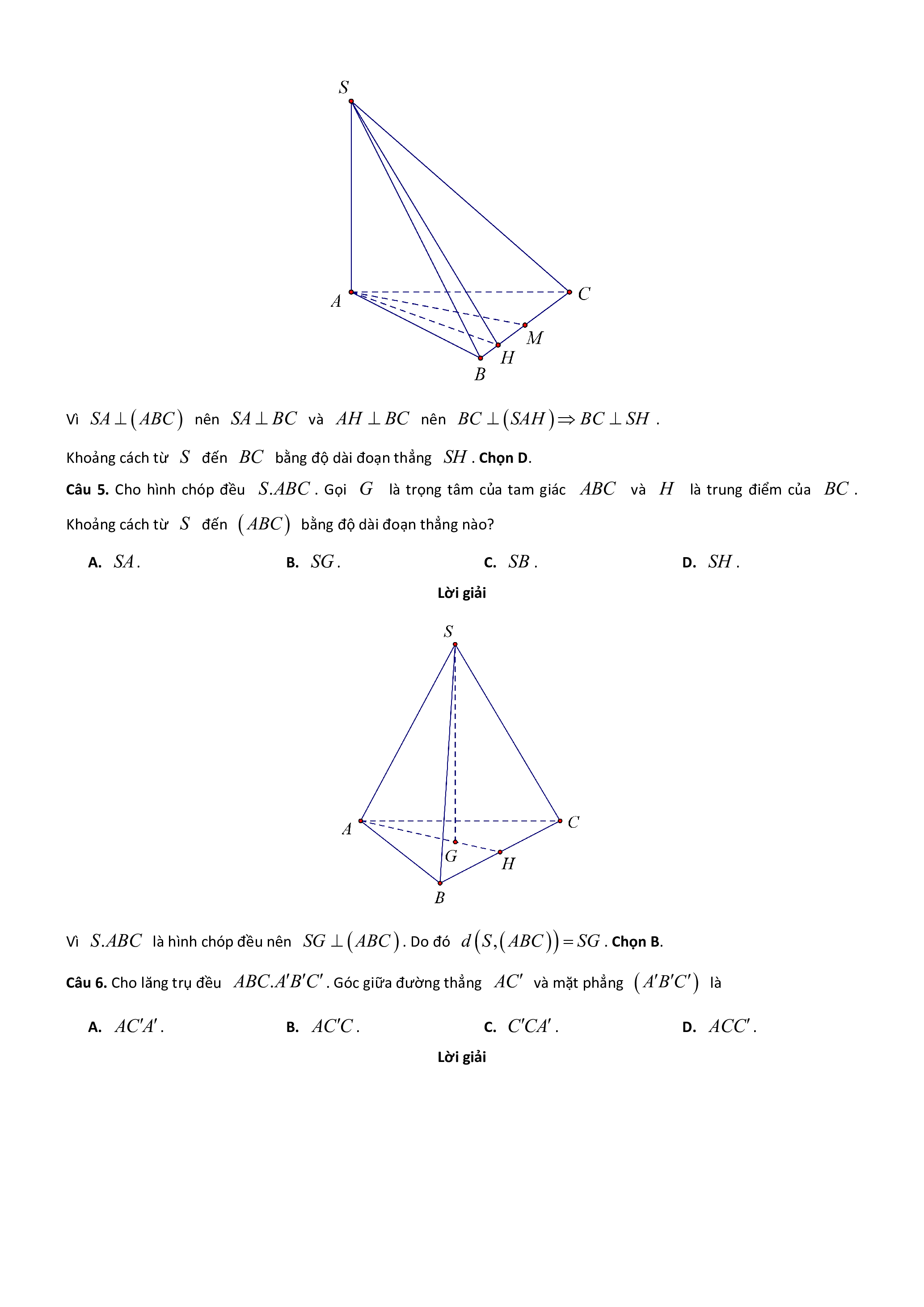 Câu 5. Cho hình chóp đều S.ABC . Gọi G là trọng tâm của tam giác ABC và H là trung điểm của BC .