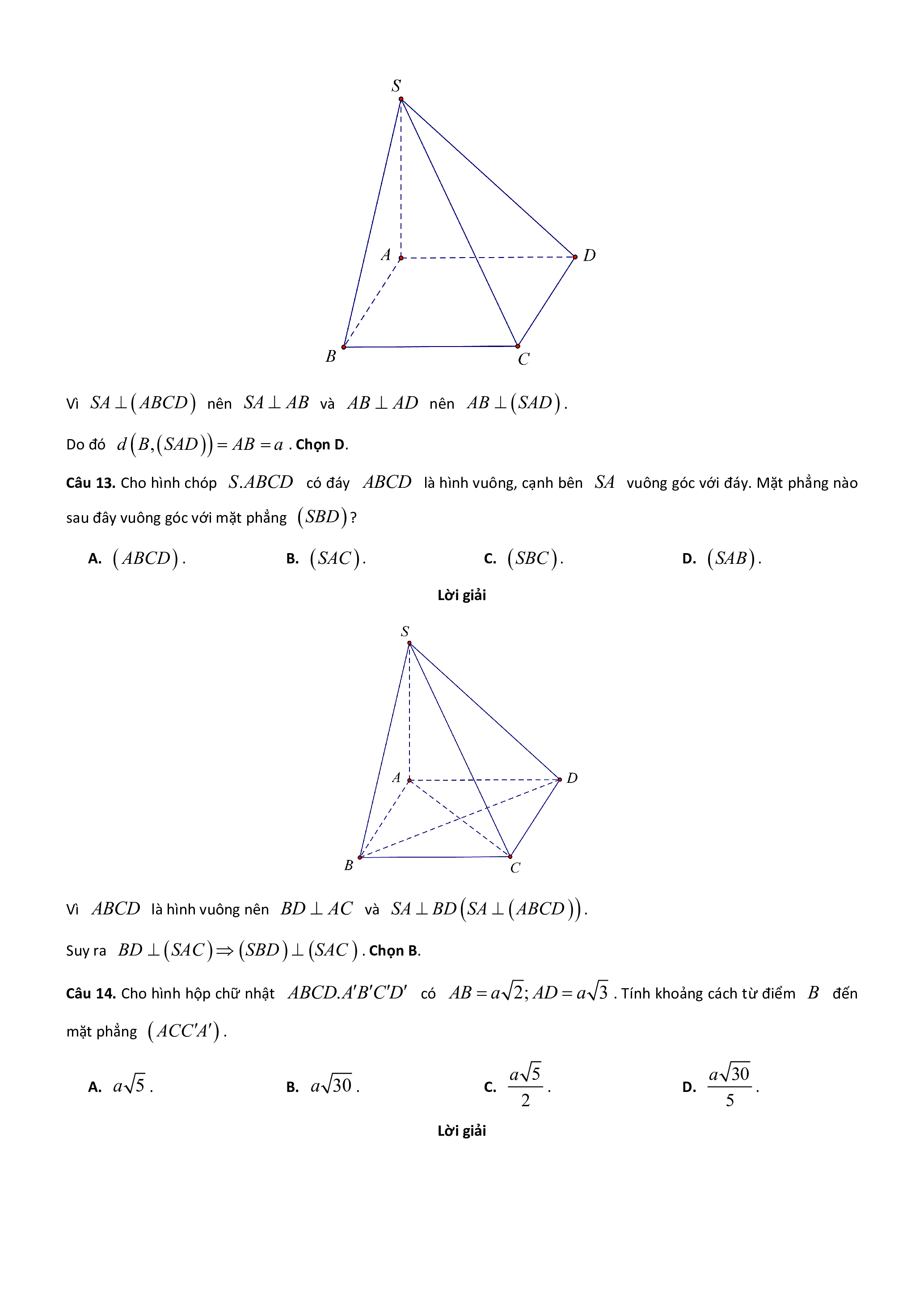 Câu 12. Cho hình chóp S.ABCD có đáy ABCD là hình chữ nhật, cạnh bên SA ABCD , AB a, AD 2a .