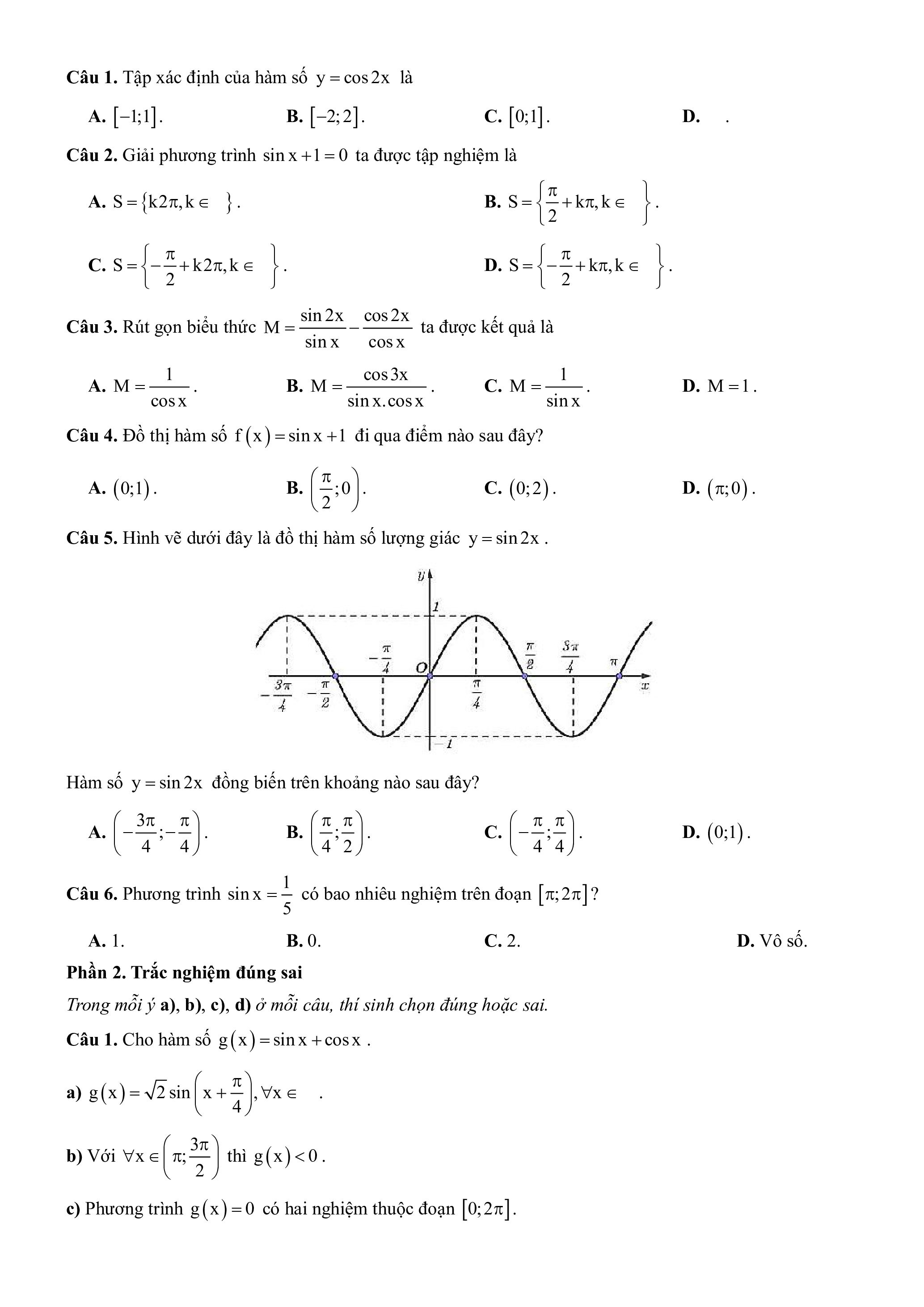 Câu 1. Tập xác định của hàm số y  cos 2x là A. 1;  1 . B. 2;2. C. 0;  1 . D. .